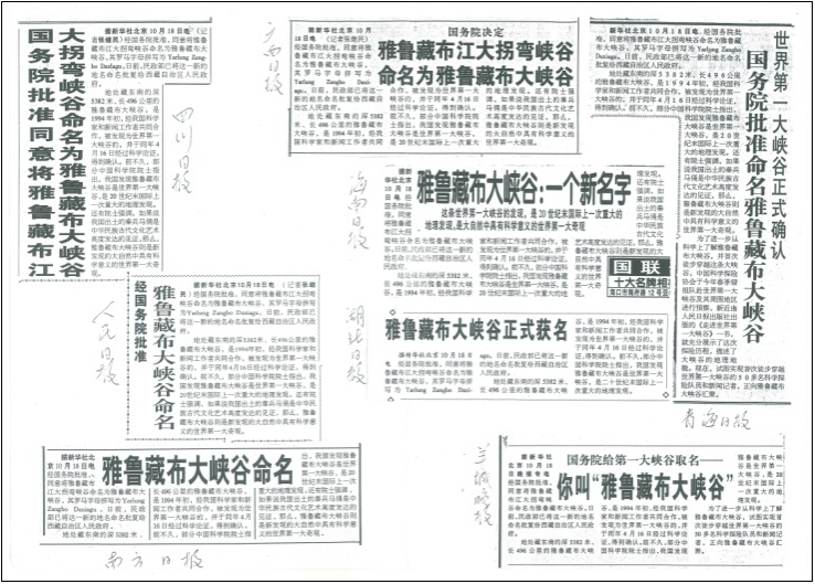 1998年10月18日,新华社发出经国务院批准对雅鲁藏布大峡谷命名一稿,被国内报纸广泛采用。(嘉宾提供)