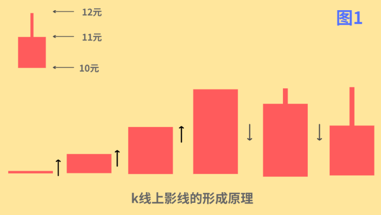 跟之前一样,我将举例为大家剖析k线上影线的形成过程,而这一过程同样需要图片来辅助理解,对应的图片还是在下方的文稿中,图1就是上影线的形成过程。所谓的上影线就是k线实体上方带有一根直线,那根直线就叫上影线。我们假设一只股票某天的开盘价是10元,当天出现过的最高价是12元,最后的收盘价是11元,而这一过程如果用k线来记录,对应的k线就会是一根带有上影线的k线。