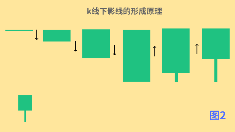 以上是上影线的形成原理,而下影线只需要反过来理解即可:股价开盘后往下走,k线柱子会向下拉伸、同时颜色变为绿色阴线。当股价从某个低点开始回升的时候k线柱子也会向上缩短,同时也会在下方留下它回升的足迹、也就是下影线,对应的图片可以查看文稿中的图2。