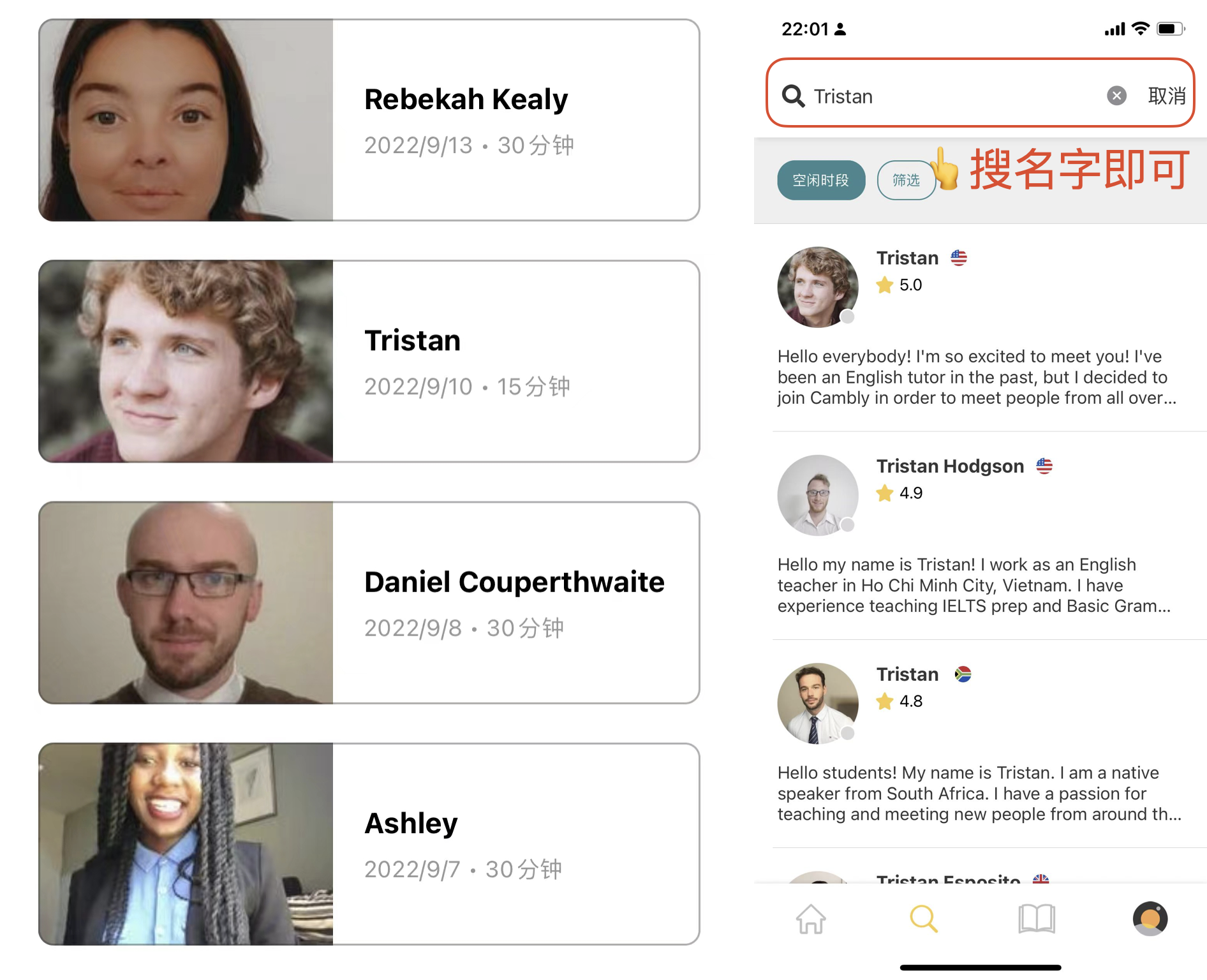 2. 领取后可直接筛选有空时间并且搜索关键词:IELTS\BUSINESS\MOVIE等感兴趣话题匹配外教进行预约对话~ 也可以采用Cambly的新功能【即时通话】寻找在线外教进行对话练习。