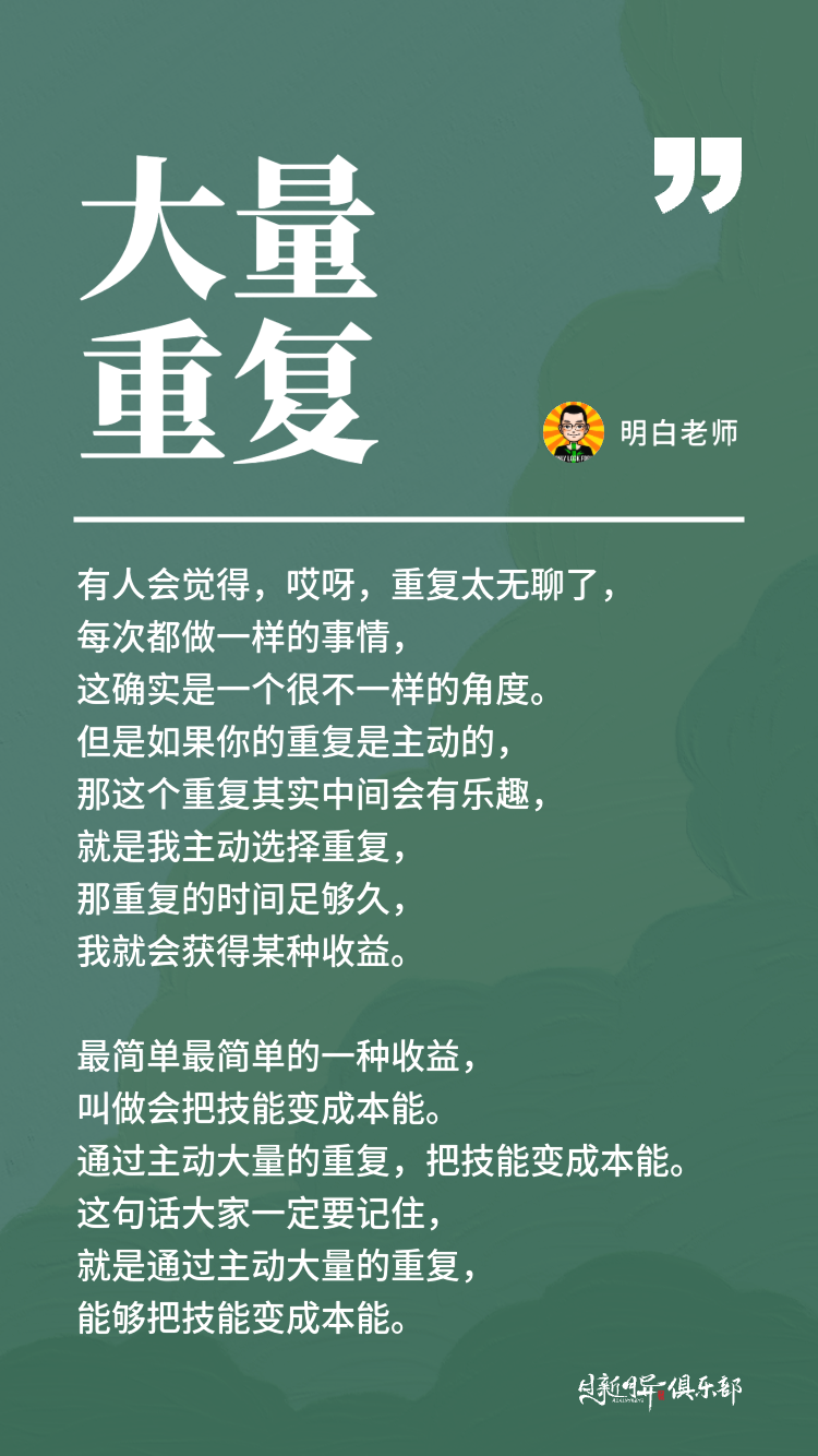 所以任何事情其实都需要通过重复,来获得一种熟练度。那我们要选择让自己主动去重复,而不是被动的,哎呀,别人说要重复,那我去重复,看到别人这么做,我也这样去做,那就会让这件事情变得很累。