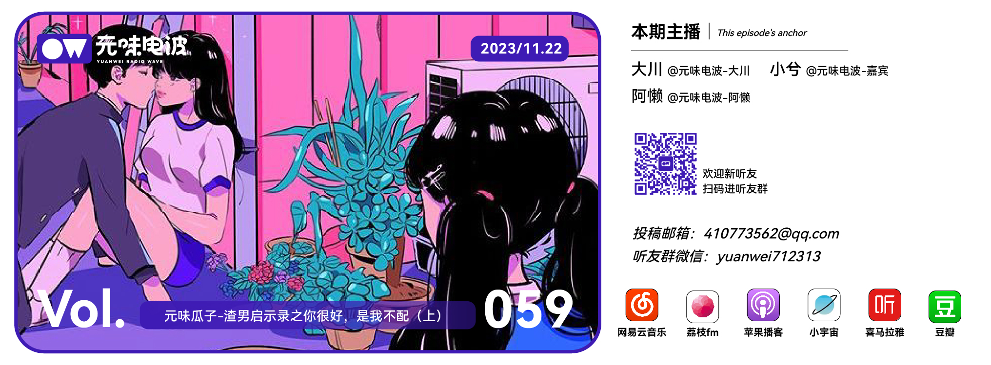 我们的节目,您可以在小宇宙、喜马拉雅、网易云音乐、荔枝 FM、荔枝播客搜索「元味电波」来订阅、收听。如果喜欢我们,也可以分享给你身边的朋友!