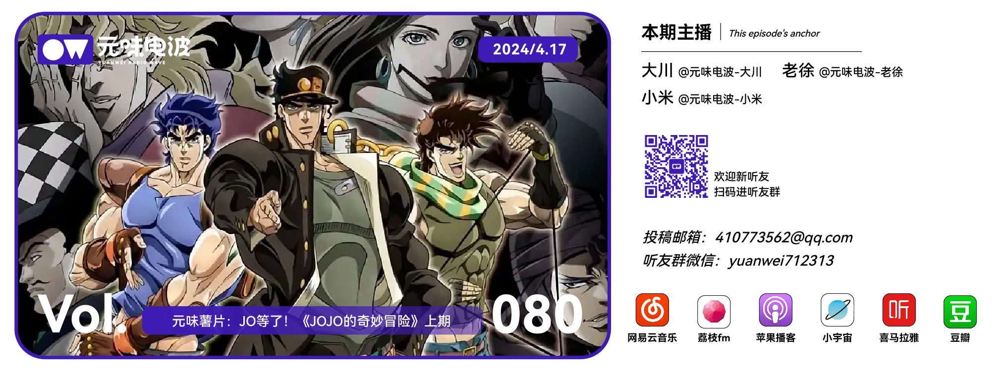我们的节目,您可以在小宇宙、喜马拉雅、网易云音乐、荔枝 FM、荔枝播客,苹果播客,豆瓣书影音搜索「元味电波」来订阅、收听。如果喜欢我们,也可以分享给你身边的朋友!