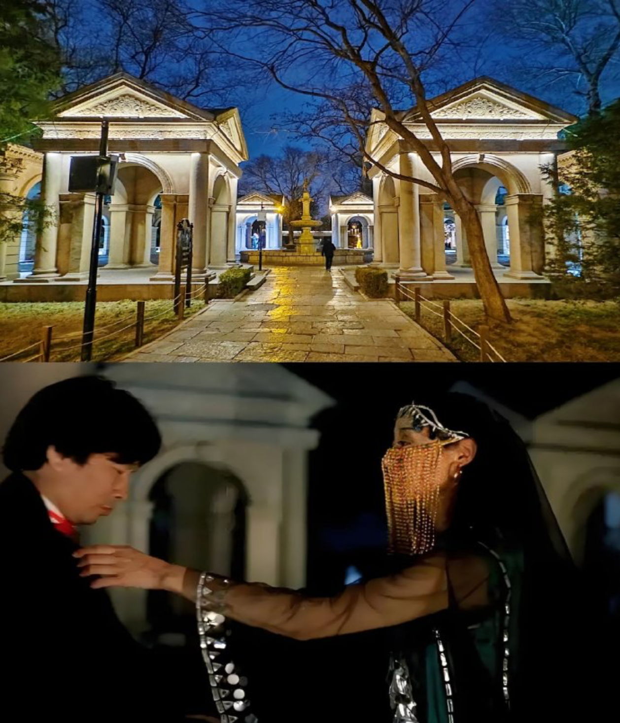 另一侧是中式园林“荟芳园”,亭台楼阁依水而建,曲桥回廊连接着假山花木,锦鲤在池子里悠游,恍惚间像走进了江南的某个庭院。