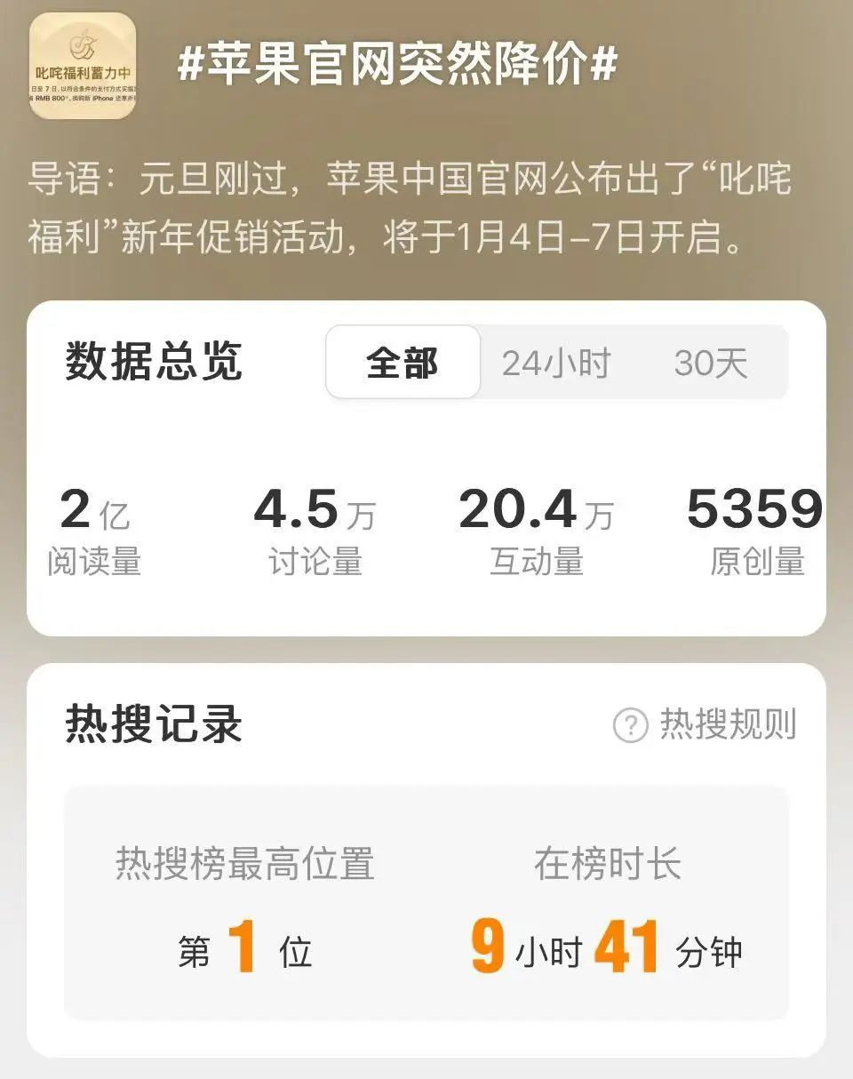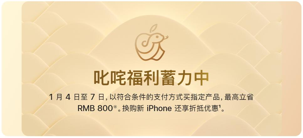 2025 年 1 月 4 日至 7 日,苹果中国官网开启 “叱咤福利蓄力中” 限时优惠活动,iPhone、Mac、iPad 等多款产品参与,最高立减 800 元,换购 iPhone 也可享受折抵优惠。这一消息迅速登上微博热搜,网友纷纷热议。