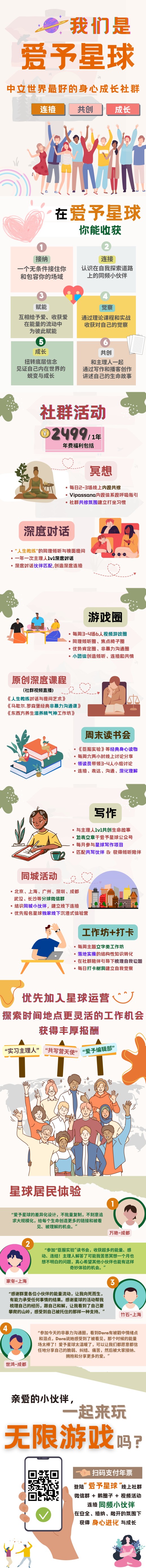 【爱予星球是“一个在玩耍中创造爱与连接的身心成长社区”。这里聚集了400+位向内探索,在生活里创造无限游戏的同频小伙伴。社群活动包括每日线上内观共修,视频游戏圈,深度对话,每月写作营和写作伙伴匹配,以及促进自我觉察的打卡和工作坊等等。下方海报了解爱予星球社群的更多信息,以及扫码进入社群的方式。】