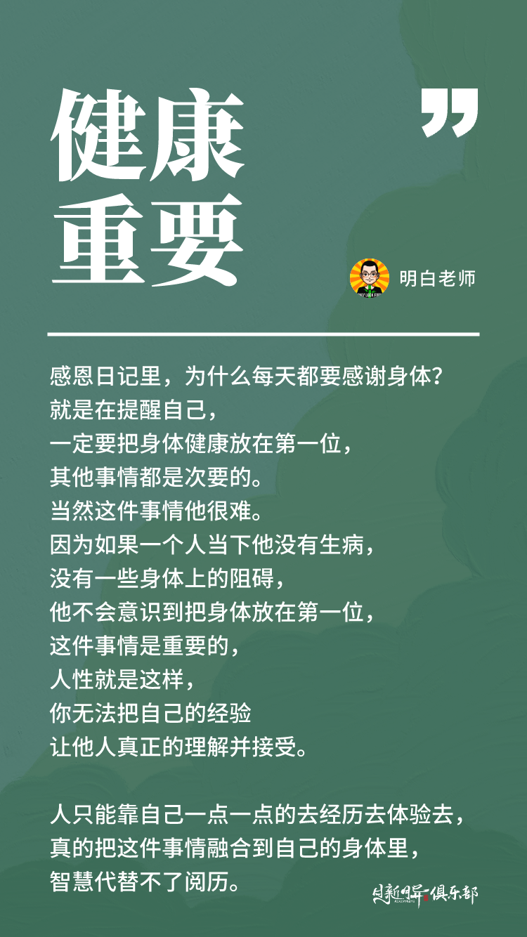 感恩日记里,为什么每天都要感谢身体?就是在提醒自己,一定要把身体健康放在第一位,其他事情都是次要的。当然这件事情他很难。因为如果一个人当下他没有生病,没有一些身体上的阻碍,他不会意识到把身体放在第一位,这件事情是重要的,人性就是这样,你无法把自己的经验让他人真正的理解并接受。
