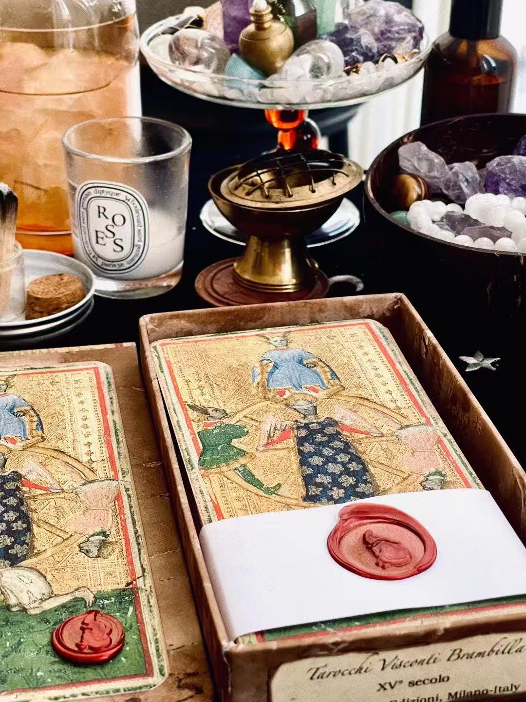 下图为彤羽老师的收藏级塔罗牌,15世纪布兰比拉版维斯康提塔罗牌,梅内格罗手绘而成
