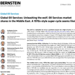 2026年3月25日,伯恩斯坦(BERNSTEIN SOCIETE GENERALE GROUP)发布研报《Global Oil Services: Unleashing the wolf》,明确指出全球油田服务行业正逼近1970年代式超级周期,地缘冲突、投资结构等多重因素共同催生这一趋势,中东市场格局重构与北美反弹将成为核心看点。 研报核心逻辑清晰:战争/破坏→油价高企→美企及海上投资增加→行业定价权提升→中东重建,这一传导链条与1973年赎罪日战争后的超级周期高度相似。当前行业具备四大支撑条件:伊朗危机前油田服务行业已呈乐观态势、90%勘探开发资本支出用于维持产量、勘探需求在12年下滑后回升、低盈亏平衡点(>35美元)的新海上盆地涌现。 行业估值已显现信号,如研报中《行业EV/收入比率回归长期均值(2002-2026)》(EXHIBIT 31)显示,2026年3月行业EV/收入比率为1.72x,与1971-72年SLB的1.62x接近,而1973-80年超级周期中SLB该比率均值达3.2x,暗示估值提升空间。 中东1110亿美元油田服务市场格局生变,《中东油田服务市场区域份额变化(2021-2025)》(EXHIBIT 3)显示,美国企业仍占32%主导地位,但较2021年的38%持续下滑;区域企业(15%)、亚洲企业(26%)、欧洲企业(19%)份额稳步上升。细分领域中,300亿美元OFS市场呈美国垄断格局(EXHIBIT 4),SLB(29.2%)、哈利伯顿(20%)等美企合计占比67.2%,而Adnoc Drilling有望未来5-10年升至区域第二。640亿美元E&C市场则是亚欧争霸(EXHIBIT 6),亚洲企业占30.3%,欧洲企业占28.6%,Saipem、 Larsen & Toubro等企业稳居头部。 短期市场焦点集中在区域分化与企业指引调整,《2026年企业指引下调风险评估》(EXHIBIT 18)显示,Adnoc L&S(80%)、Adnoc Drilling(60%)、Technip Energies(50%)下调风险最高,但研报认为指引下调反而可能成为股价催化剂,类似SLB下调2026年一季度指引后股价反而上涨的情况。北美市场方面,《美国未完工井(DUCs)数量变化(2013-2026)》(EXHIBIT 24)显示,当前DUCs数量处于13年低位,叠加油价升至100美元/桶,Tenaris、Vallourec、Viridien等北美业务占比高的企业将率先受益。 这一超级周期并非简单历史重演,但行业财务强度、投资需求、估值基础均已具备支撑。对于关注全球能源产业的读者而言,跟踪贝克休斯钻机数量、美国钢铁进口数据等指标,将能更精准把握周期节奏。 需要完整报告,可私信我,进我的外资研报知识库:知识库是一个汇集全球顶级投行(如高盛、摩根士丹利、瑞银等)最新研究报告的知识库。它每日更新,内容覆盖全球宏观经济、股票市场、行业趋势及公司深度分析。是你手机里的经济顾问智囊团,能够根据你的个性化问题,基于专业的私有数据库,给你最为精准可靠的答案。