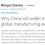 在全球贸易摩擦不断、供应链多元化呼声高涨的当下,中国制造业出口不仅没被削弱,反而要进一步扩大领先优势。摩根士丹利2025年12月发布的《Why China will widen its lead in global manufacturing exports》研报明确指出,到2030年,中国全球出口市场份额将从当前的15%升至16.5%,出口额有望突破5.3万亿美元。 这一判断绝非空穴来风,研报用海量数据给出了硬核支撑。先看核心图表Exhibit 1(研报开篇核心预测图),它清晰展示了中国出口市场份额的三大情景:基准情景下2030年达16.5%,乐观情景能冲到18%,即便悲观情景也能守住15%的现有份额。这意味着无论外部环境如何变化,中国制造业的全球地位都难以撼动。 再看Exhibit 7(研报第8页),2024年中国多个品类的全球出口份额堪称“碾压级”:电池占46%、手机36%、半导体组件34%、电脑31%,前四大优势品类份额均超30%。更关键的是,这些不是低附加值产品,而是技术密集型的核心制造领域,这正是中国制造业升级的最佳证明。 Exhibit 4(研报第4页)的数据更能体现长期竞争力:中国STEM毕业生占比高达41%,是美国的两倍,每年新增约500万STEM人才。截至2024年,中国高等教育人口已达2.92亿,过去三年年均新增1400万,这样庞大的人才池,为先进制造提供了源源不断的智力支撑。 还有Exhibit 14(研报第6页),它揭示了一个关键事实:中国在高复杂度产品的出口能力上,超过了其他所有亚洲主要经济体的总和。这意味着想要替代中国产能,需要巨额投资、漫长时间和巨大的商业风险,不是简单的供应链转移就能实现的。 研报指出,中国的优势根源在于三点:一是提前布局战略产业,15年前就将EV列为重点,如今在新能源、机器人等领域形成壁垒;二是供应链整合能力,政策、资金、监管形成合力,地方快速执行;三是适应全球需求变化,虽然对美出口占比从21.6%降至11%,但对其他国家的出口份额从13.2%升至17%,85%的全球市场为中国提供了广阔空间。 当然风险也存在,比如产能过剩、通缩压力和贸易壁垒,但研报认为,中国在EV、电池、机器人等赛道的优势已形成惯性,即便面临挑战,至少能守住现有市场份额。 对投资者和从业者来说,这意味着中国高端制造的红利仍在持续,相关产业链将长期受益于全球份额的提升。想要解锁完整研报数据和更多行业细节,可加入我的知识星球获取顶级投行的深度分析,为决策提供专业支撑。